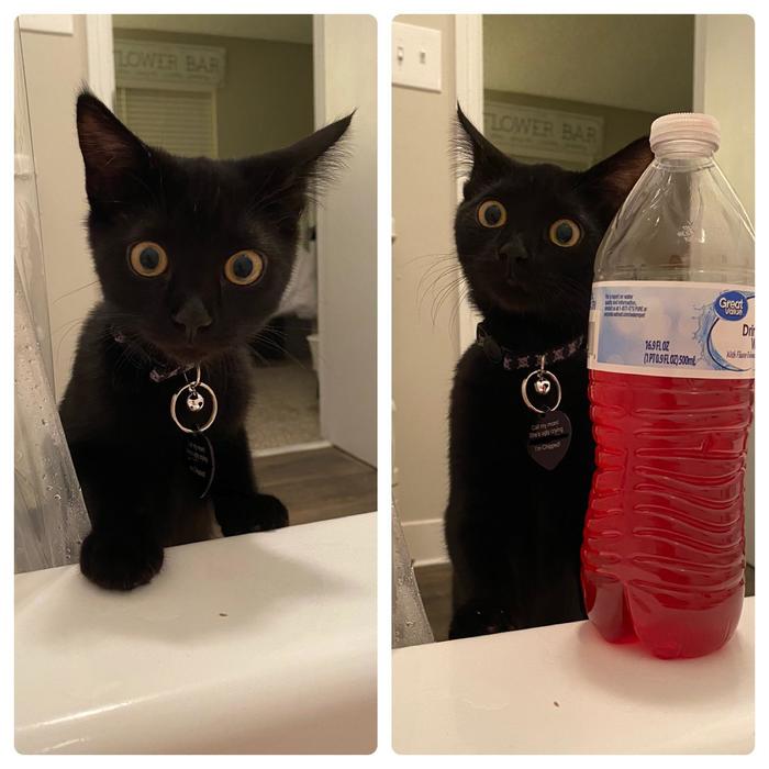 «Реакция Туна-Фиш на меня в ванне. Она самая выразительная кошка, которая когда-либо у меня была»