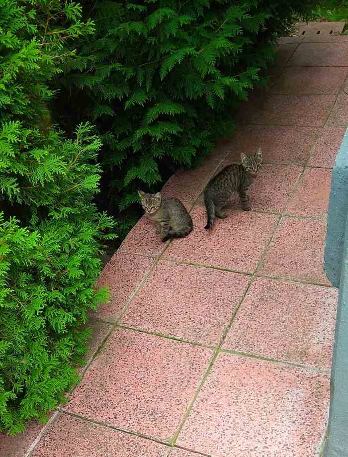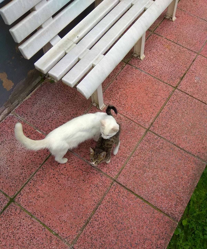 Их мама (белая кошечка) безумно ласковая. Её я кормлю уже 4 месяца. Она совсем ручная, сама постоянно трётся об ноги и мурчит — видно, что раньше была домашней, но кто-то очень недобросовестный выкинул её из дома. Котята поначалу были совсем дикими, но спустя 2 недели кормёшки уже давали себя погладить.
