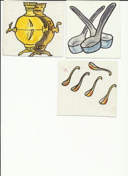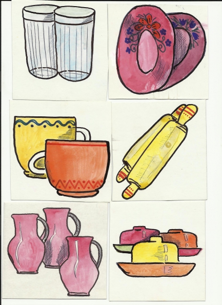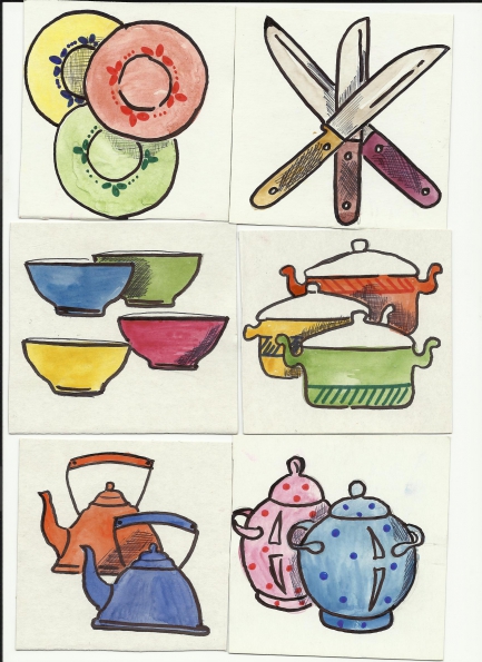 2. Когда кастрюли и чашки бежали по полям, то конечно перепутались. Посмотрите внимательно, определите какая здесь посуда, посчитайте ее (одна чашка, две чашки,.).